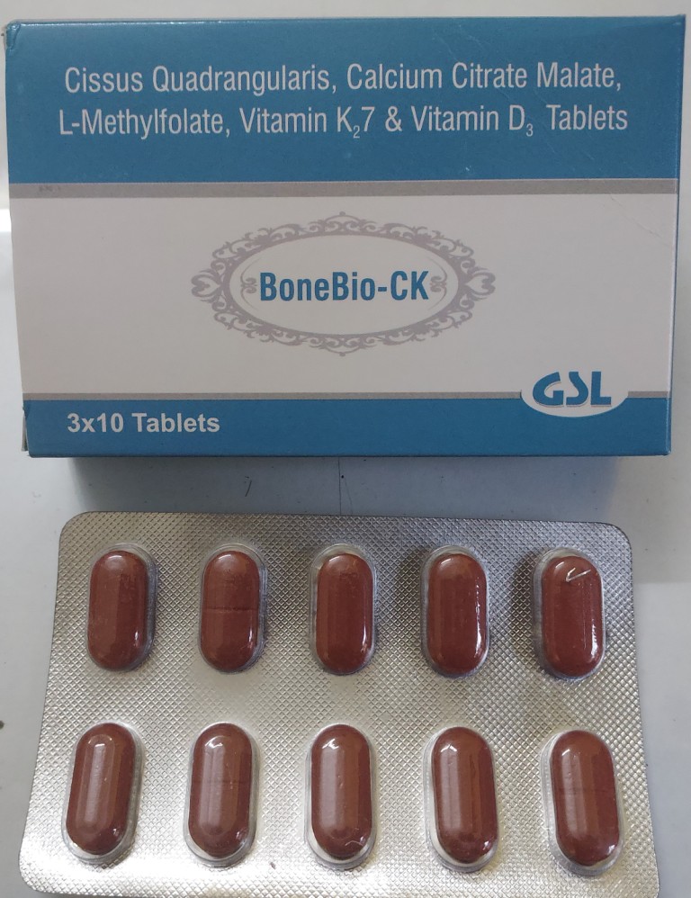 Composition : Cissus Quadrangularis-500 mg+Calcium Citrate Malate-1000mg+L-Methylfolate-10mg+Vitamin K27-45mcg.+Vitamin D3-1000IC